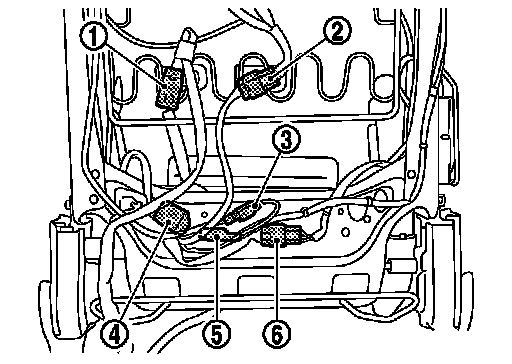 Locate side support switch harness (4) in the upper position of seat control harness (2) and fix to seat cushion outer finisher (1) boss using a self locking band (5) as shown in the figure.