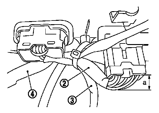 - Adjust and fix that the ejected length (a) of harness is 10 mm (0.39 in) or less from the backside of connector for the seat control harness (2) switch side.