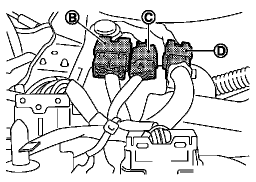 - Locate lumbar support switch harness crossing in the upper position, fix seat control harness connector (B), lumbar support switch harness connector (C), and side support harness connector (D) as shown in the figure.