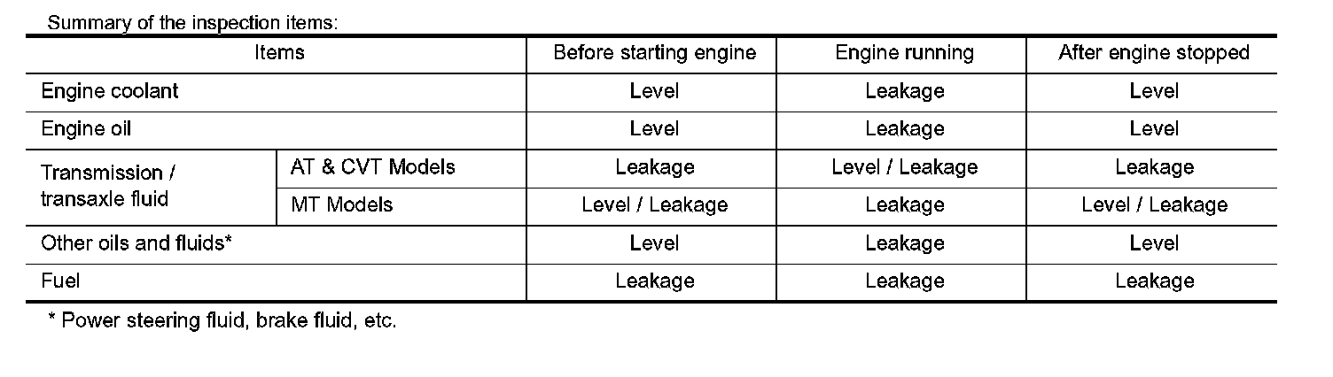 - Warm up engine thoroughly to check that there is no leakage of fuel, or any oil/fluids including engine oil and engine coolant.