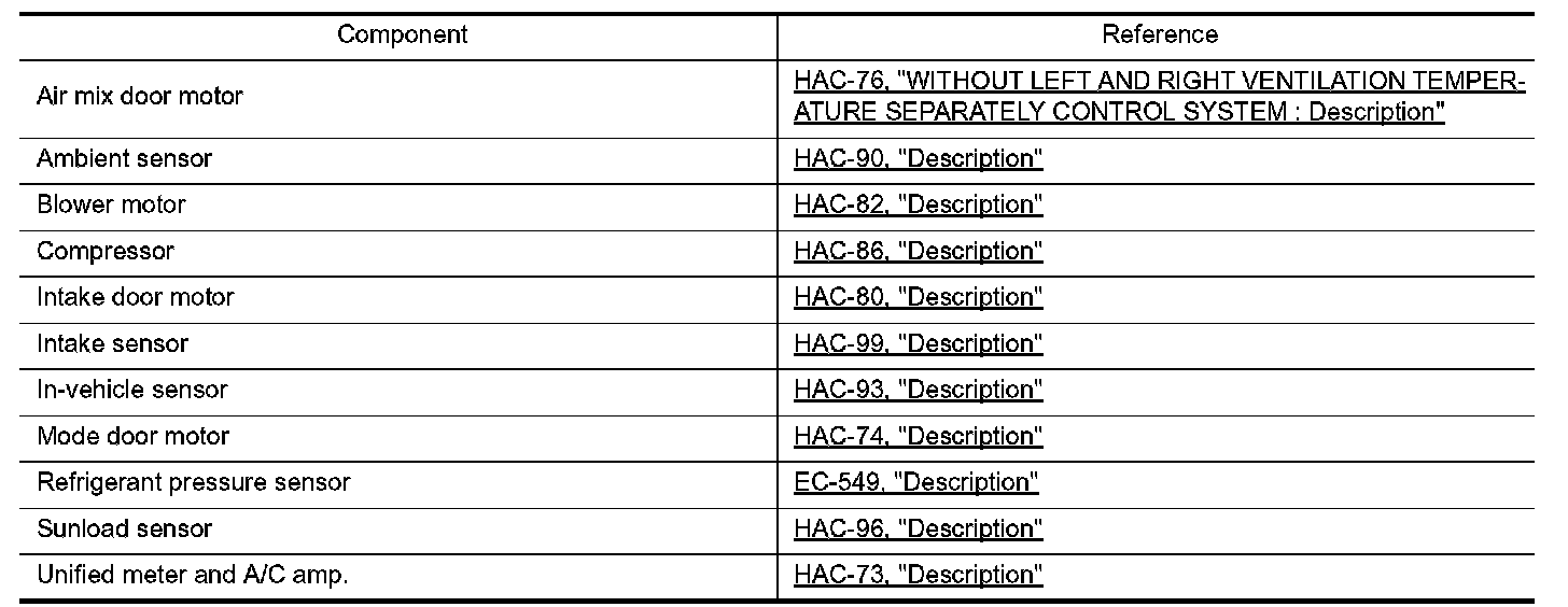 WITHOUT LEFT AND RIGHT VENTILATION TEMPERATURE SEPARATELY CONTROL SYSTEM : Component Description