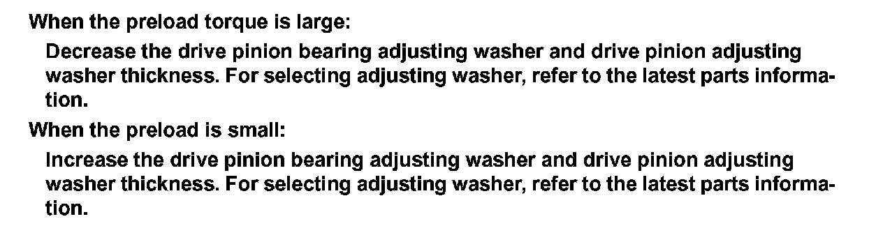 6.If the pinion bearing preload torque is outside the specification, use a thicker/thinner drive pinion bearing adjusting washer and drive pinion adjusting washer to adjust.