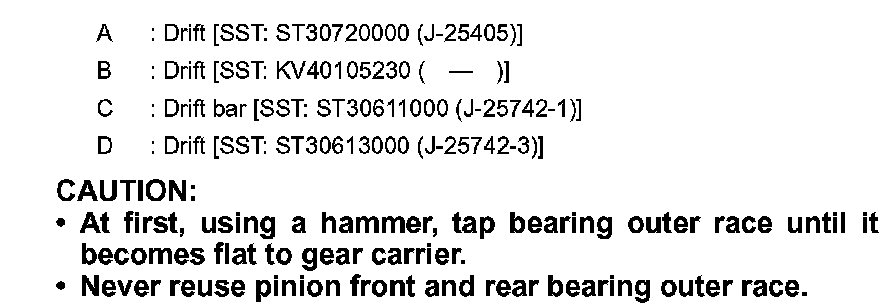 1.Install front bearing outer race (1) and rear bearing outer race (2) using drifts (A, B, and D) and drift bar (C).