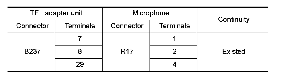 3.Check continuity between TEL adapter unit harness connector and microphone harness connector.