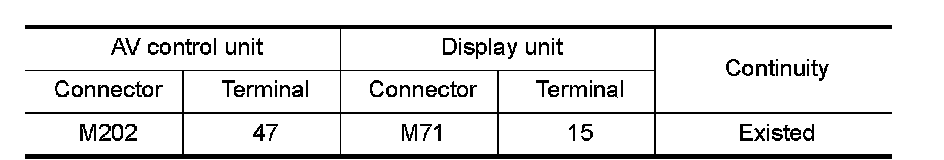 3.Check continuity between AV control unit harness connector and display unit harness connector.