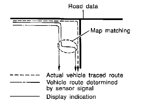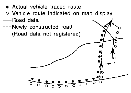 Also, map-matching does not function correctly when road pattern stored in the map data and the actual road pattern are different due to repair, etc.