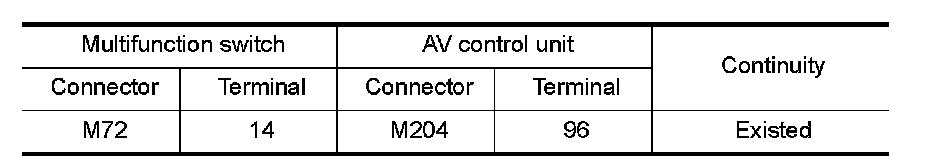 3.Check continuity between multifunction switch harness connector and AV control unit harness connector.