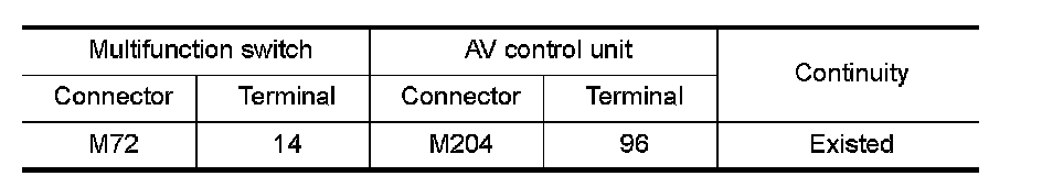 3.Check continuity between multifunction switch harness connector and AV control unit harness connector.