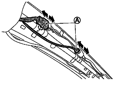2.Remove antenna feeder fixing clips using a remover tool after removing front pillar garnish (LH), then disconnect antenna feeder connectors (A).
