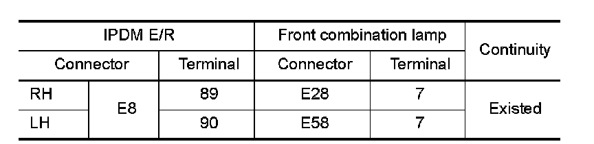 3.Check continuity between the IPDM E/R harness connector and the front combination lamp harness connector.