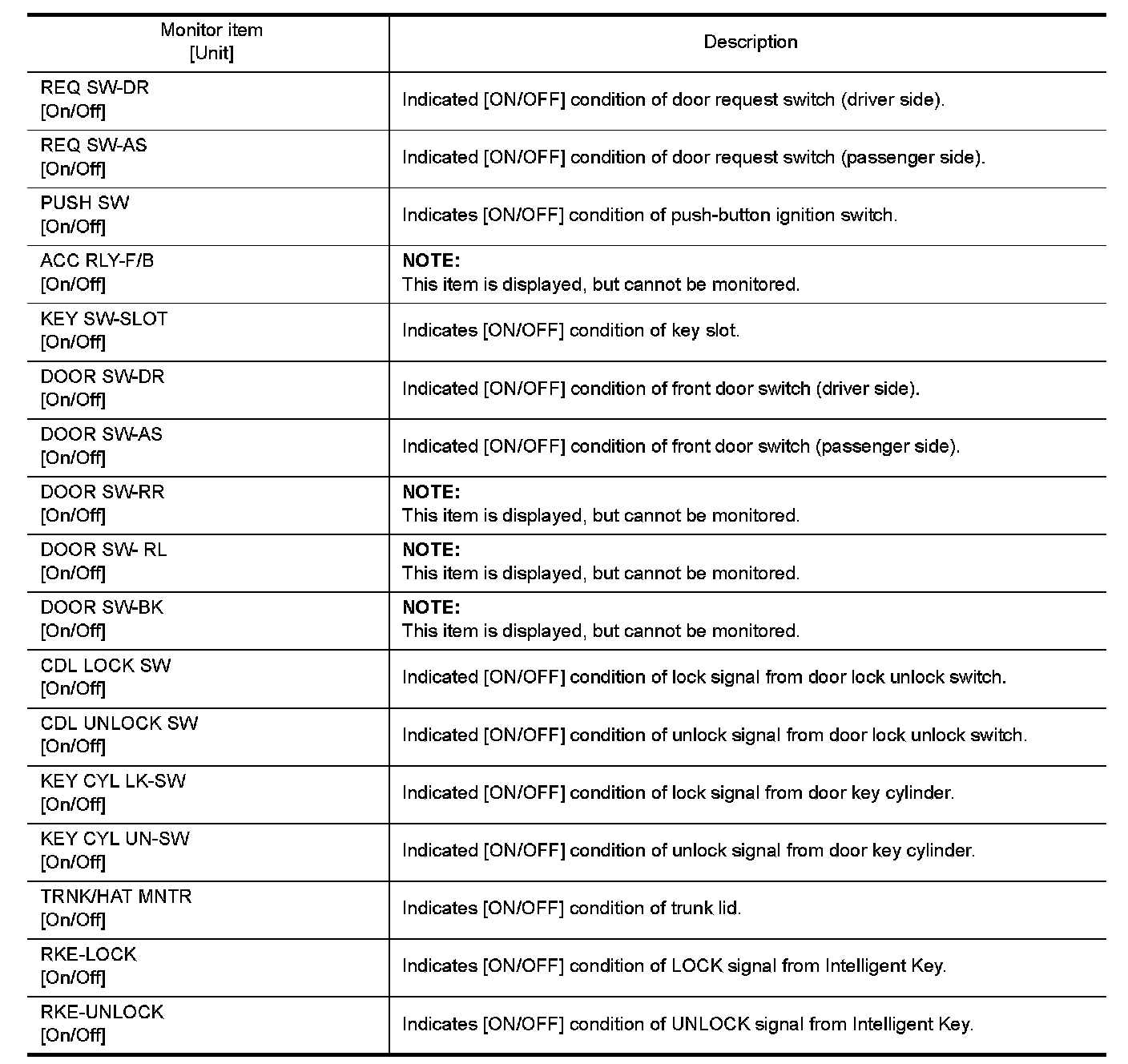 The following table includes information (items) inapplicable to this vehicle. For information (items) applicable to this vehicle, refer to CONSULT display items.