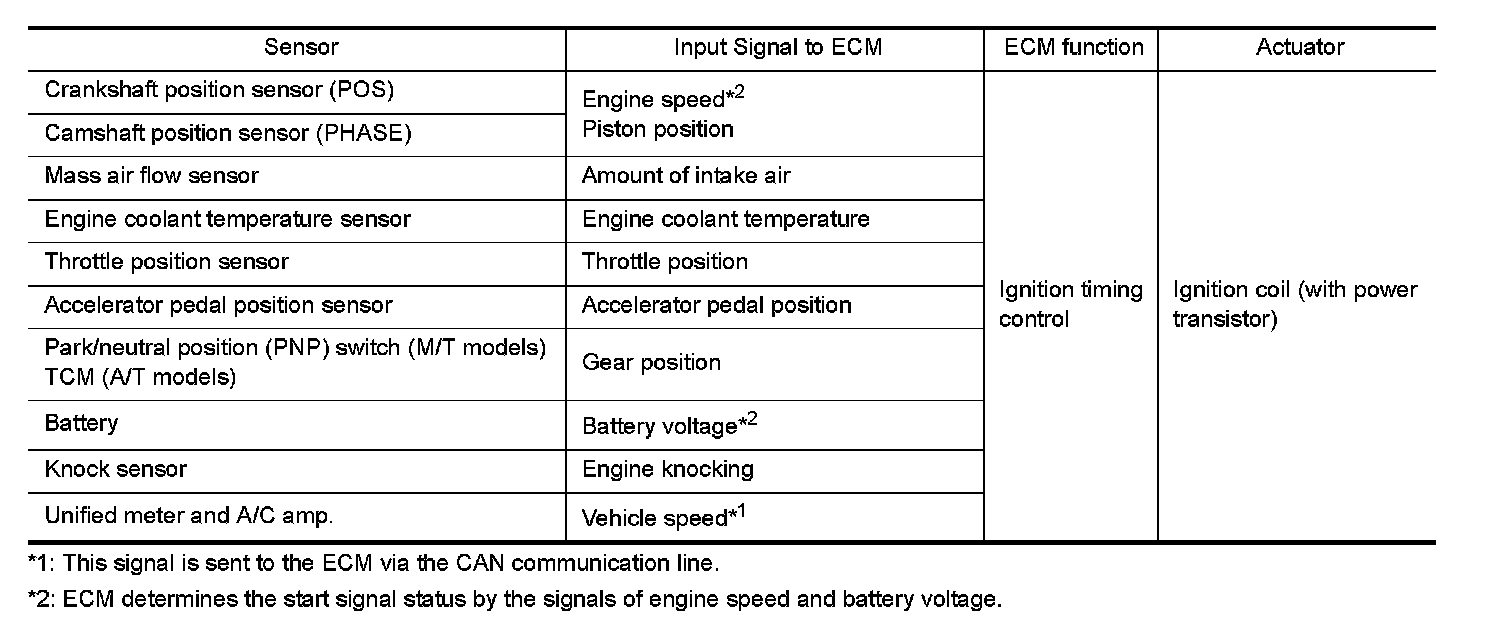 The ECM receives information such as the injection pulse width and camshaft position sensor (PHASE) signal. Computing this information, ignition signals are transmitted to the power transistor.