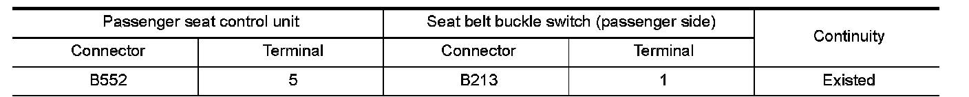 2.Check continuity between passenger seat control unit harness connector and seat belt buckle switch (passenger side) harness connector.