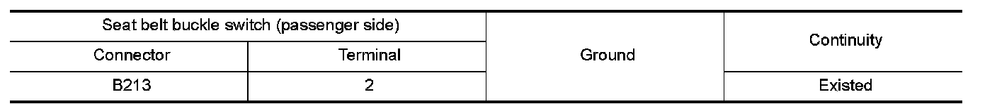 Check continuity between seat belt buckle switch (passenger side) harness connector and ground.