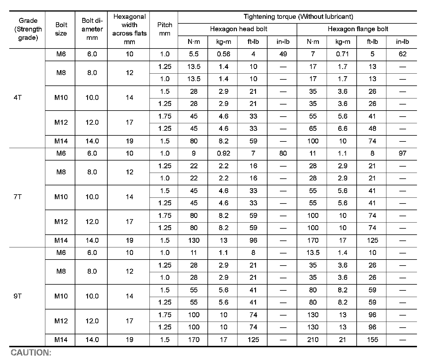 2.However, use tightening torque without lubricant for the following cases. Friction coefficient stabilizer is not applied to the following bolts/nuts.