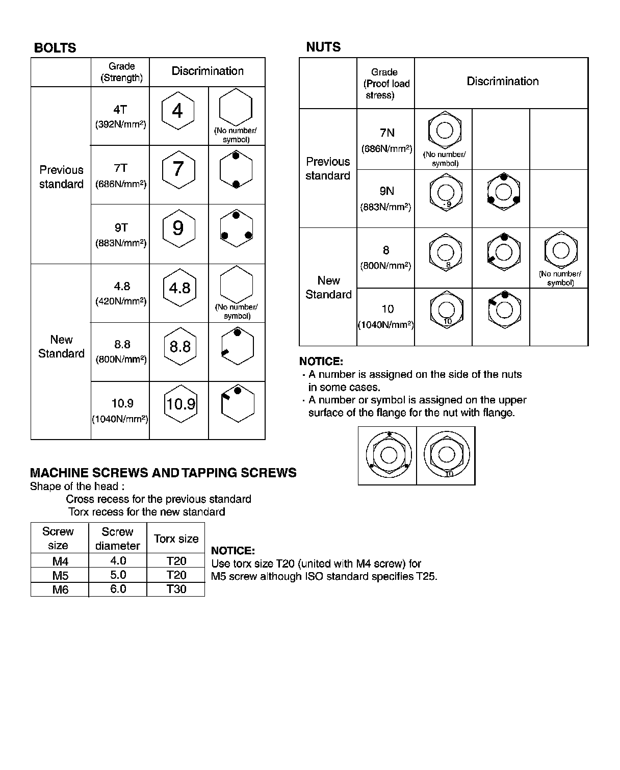 - The bolts/nuts in these tables have a strength (discrimination) number/symbol assigned to the head or the like. As to the relation between the strength grade in these tables and the strength (discrimination) number/symbol, refer to "DISCRIMINATION OF BOLTS AND NUTS".