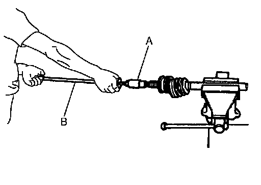 3.Screw the drive shaft puller (A) 30 mm (1.18 in) or more into the thread of joint sub-assembly, and pull joint sub-assembly with a sliding hammer (B) from shaft.