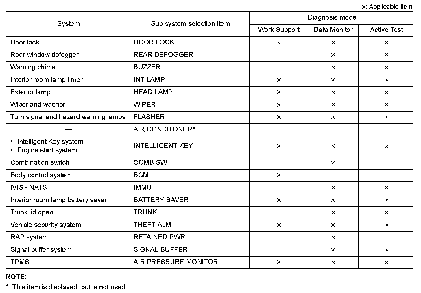 It can perform the diagnosis modes except the following for all sub system selection items.