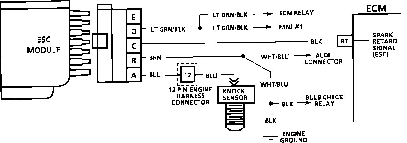 This system performs a functional check once per start up to check the ESC system. To perform this test, the ECM will advance the spark when coolant temperature is above 95° C and at a high load condition (near WOT). The ECM then checks for a signal at CKT B7 to see if a knock has been detected.