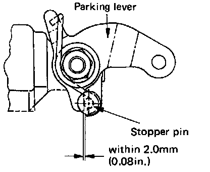 12. Check to see if there is any parking brake cable slack, and if the clearance between the parking lever of the disc brake and the stopper pin is within the limits noted above in step 7. If slack is apparent, or if the clearance is not within these limits, again repeat steps 1 through 11.