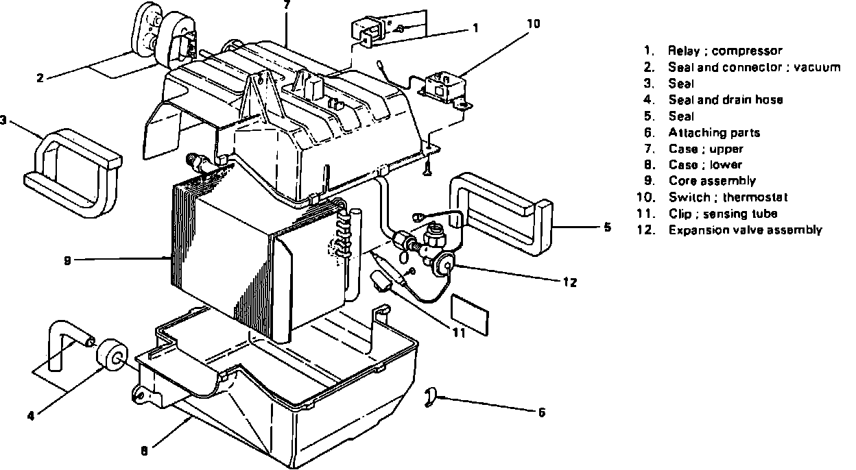 8. Remove clips securing evaporator case and remove upper case half, carefully removing thermostatic switch sensor from evaporator core.