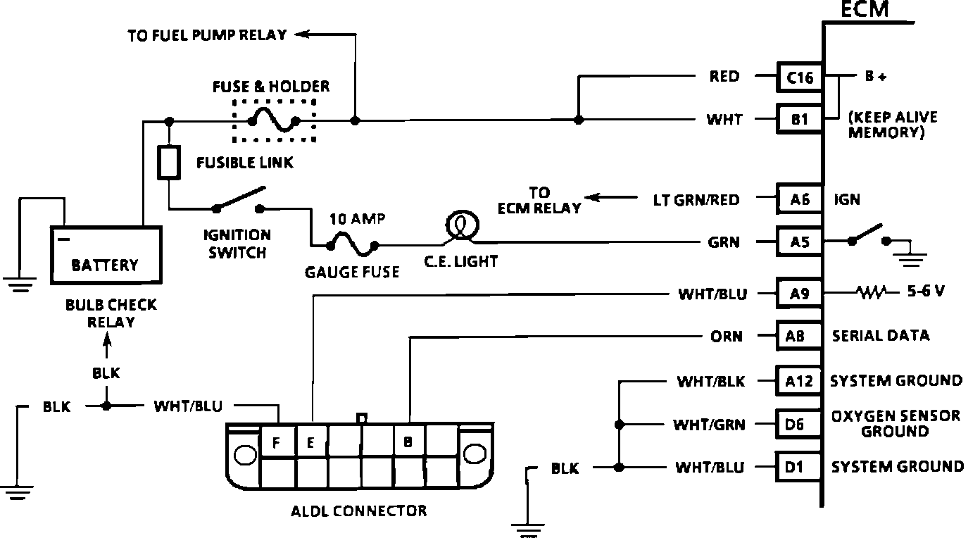 There should always be a steady "CHECK ENGINE" light, when the ignition is "ON" and engine stopped. Ignition voltage is supplied directly to the light bulb. The Electronic Control Module (ECM) will control the light and turn it "ON" by providing a ground path through CKT 03 to the ECM.