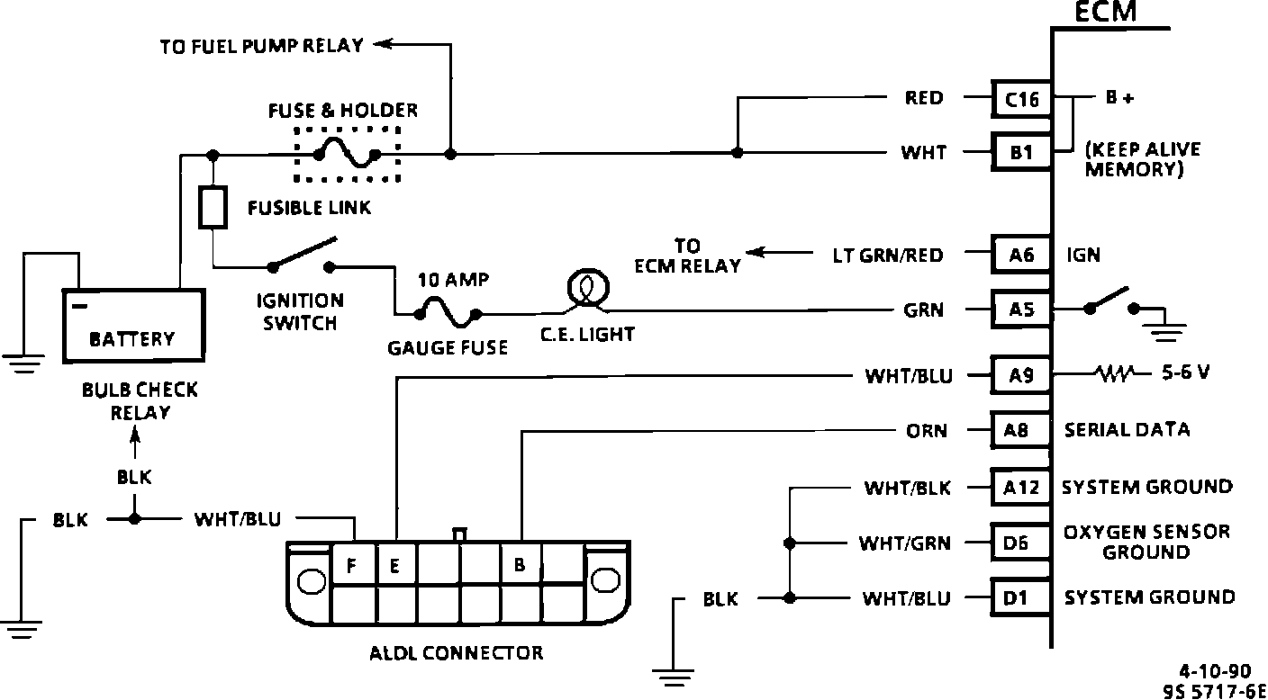 There should always be a steady "CHECK ENGINE" light, when the ignition is "ON" and engine stopped. Ignition voltage is supplied directly to the light bulb. The Electronic Control Module (ECM) will control the light and turn it "ON" by providing a ground path through CKT A5 to the ECM.