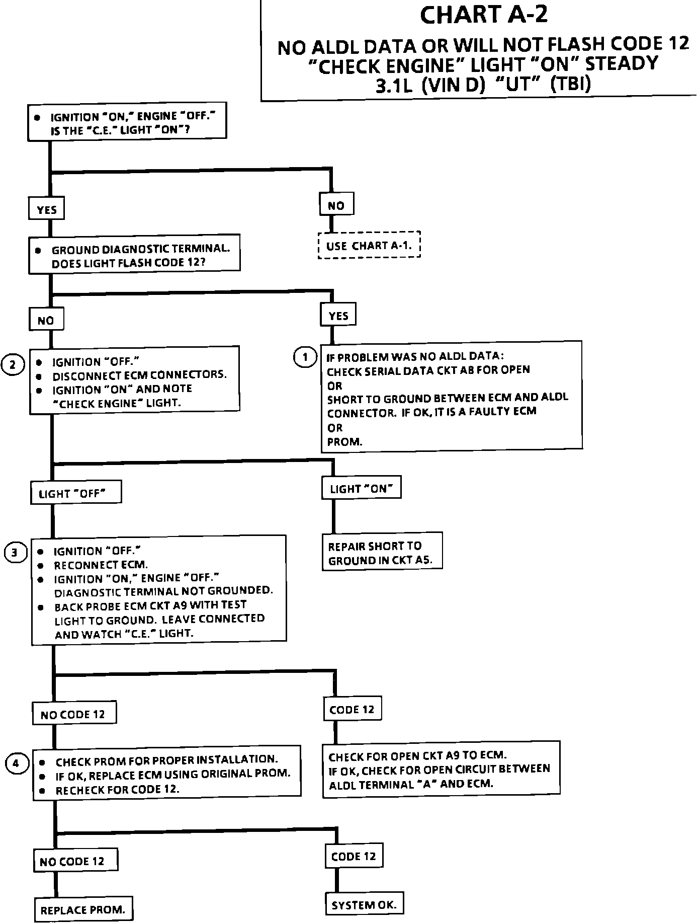 Chart A-2 - No ALDL Data Or Won't Flash Code 12 Check Engine Light On Steady: