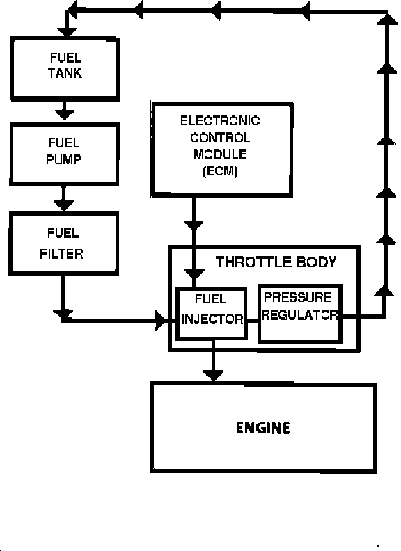 The fuel supply system begins with gasoline in the fuel tank. An electric fuel pump, located in the fuel tank with the fuel level gauge sending unit, pumps fuel to the throttle body assembly through an in-line filter. The pump is designed to supply fuel at a pressure above the pressure needed by the injectors. A pressure regulator located in the throttle body assembly keeps the fuel available to the injectors at a constant pressure. The unused fuel is returned to the fuel tank by a separate line.