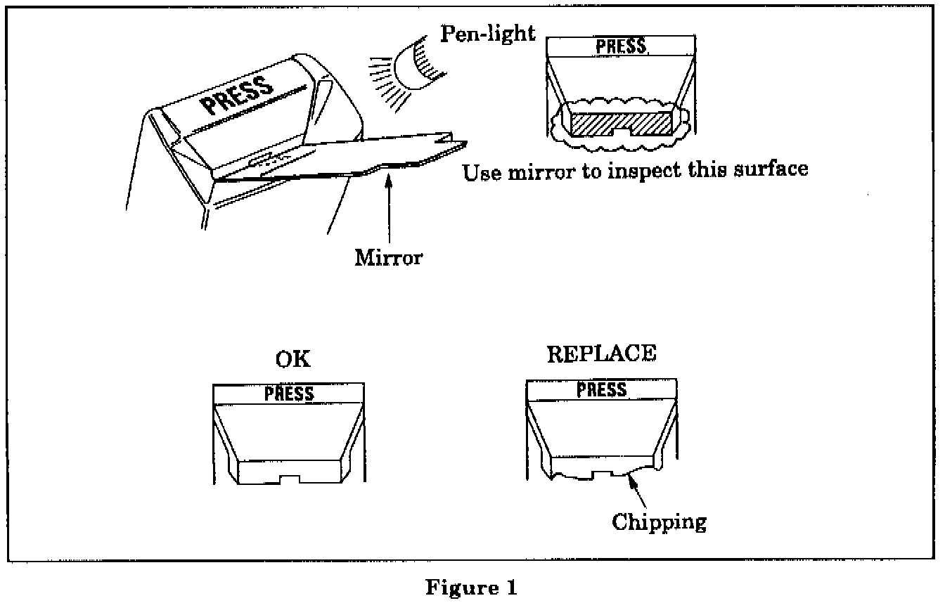 OUTLINE1. Using the inspection mirror (Part No. 2-90999-100-0) included with this Campaign Bulletin, and a pen light, inspect both the driver and passenger front seat belt buckle release buttons for chipping or cracking (Figure 1).