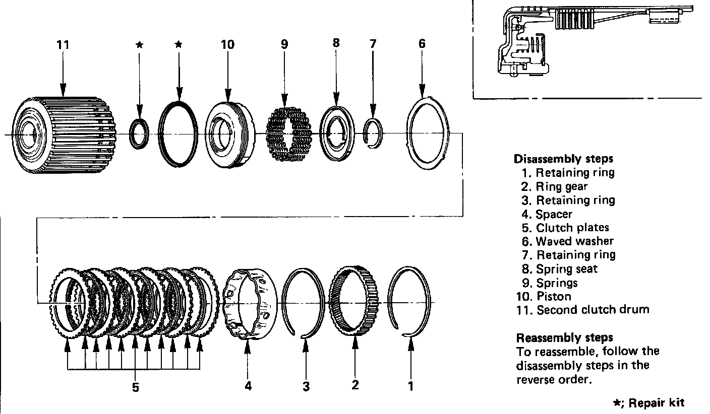 ^ If any damage, deformation or local wear is found in a retaining ring, ring gear, spacer, clutch plates, piston seals, return spring or spring seat, replace
