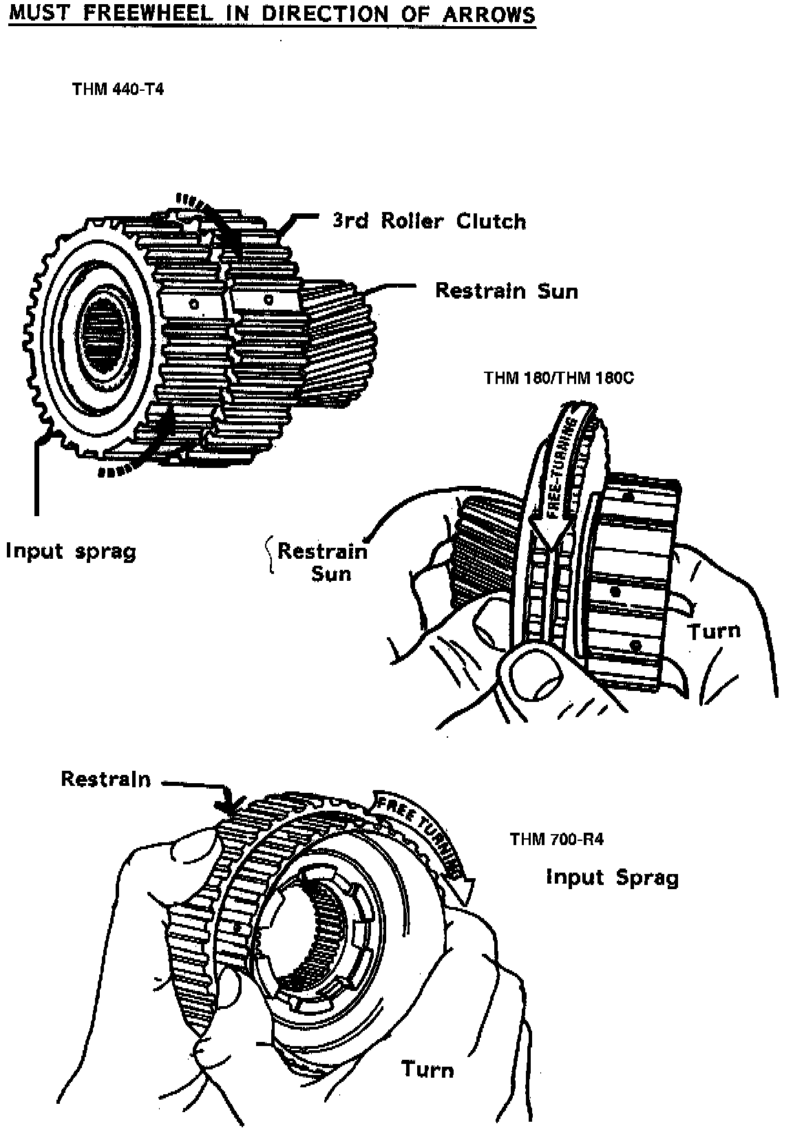 1. Sprags that hold a given planetary gear (Sun, ring, or planetary carrier) stationary to the case will freewheel in third gear.