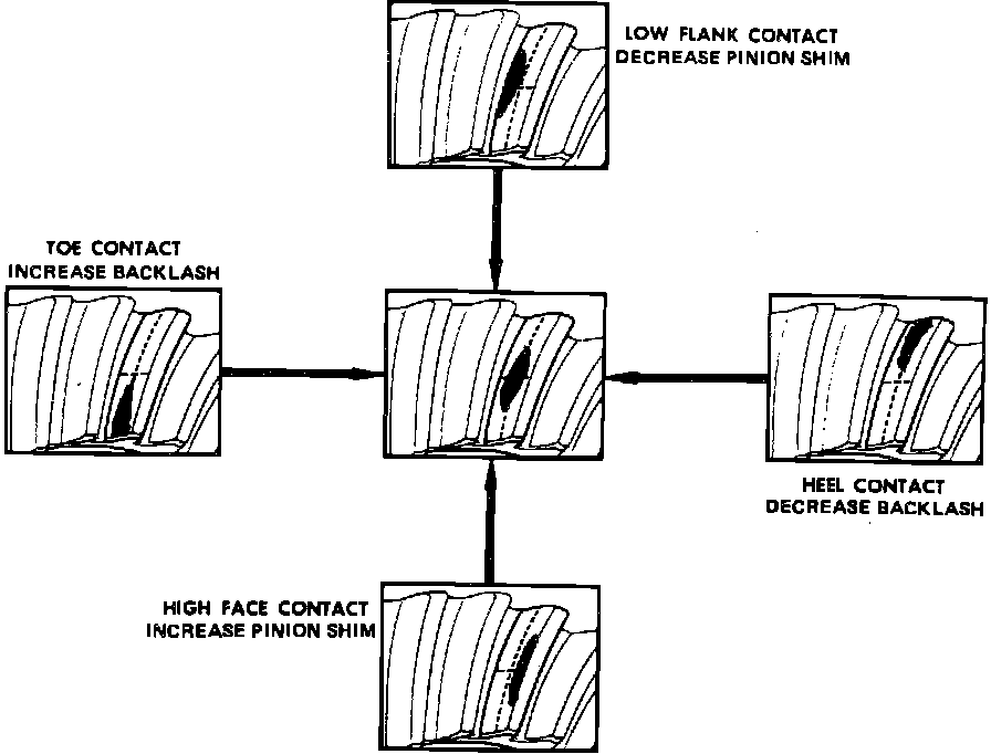 Backlash and position of drive pinion in differential carrier are the only two adjustments which can be made that will affect the contact pattern. The effects of bearing preload adjustments are not readily apparent with tooth pattern checks. However, these adjustments should be within specifications before proceeding with backlash and drive pinion adjustments.