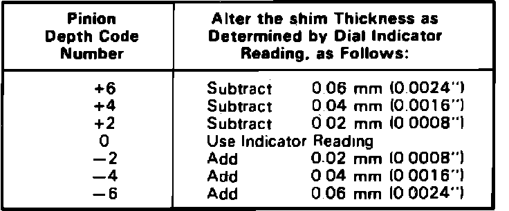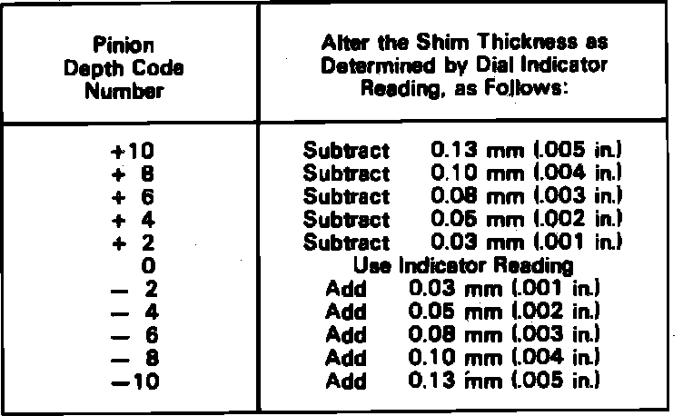 8. Carefully swing plunger off gauge plate and note reading on dial indicator. Recheck to verify reading. The reading on the dial is the correct dimension for the rear pinion depth shim on a ``nominal'' pinion. Check drive pinion head markings. The pinion depth code which is in the lowest position of the three numbers, Fig. 19, indicates a necessary change in pinion mounting distance. A plus number indicates the need for a greater mounting distance (achieved by decreasing shim thickness). A minus number indicates the need for a smaller mounting distance (achieved by increasing shim thickness). If no pinion depth code is stamped on the head, the pinion is ``nominal.'' In this case, proceed to step 10.