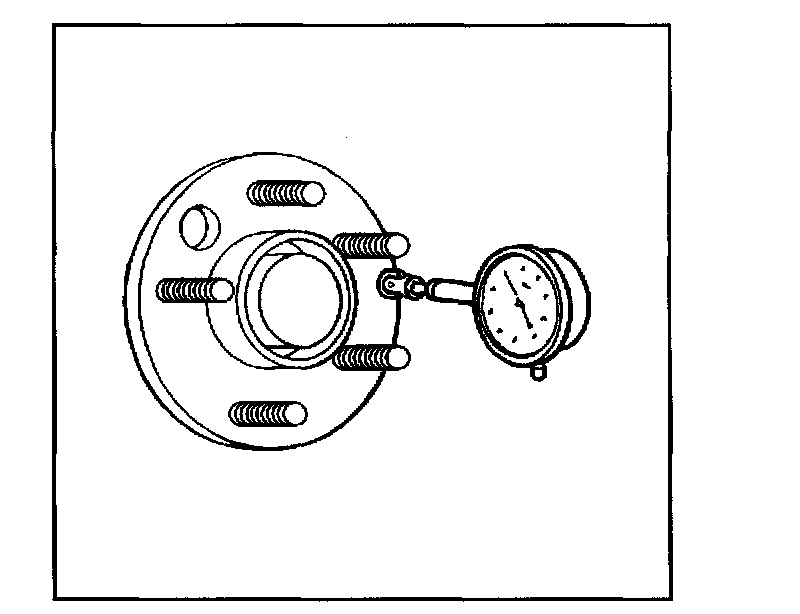 When lateral runout occurs, inspect the wheel hub/axle flange runout if you are performing an on-vehicle test procedure, but not during off-vehicle testing. The tolerances provided are only guidelines. Perform corrections only if the on-vehicle runout cannot be brought to within tolerance.1. Position the dial indicator on the machined surface of the hub, the axle flange, or the rotor outside of the wheel studs.