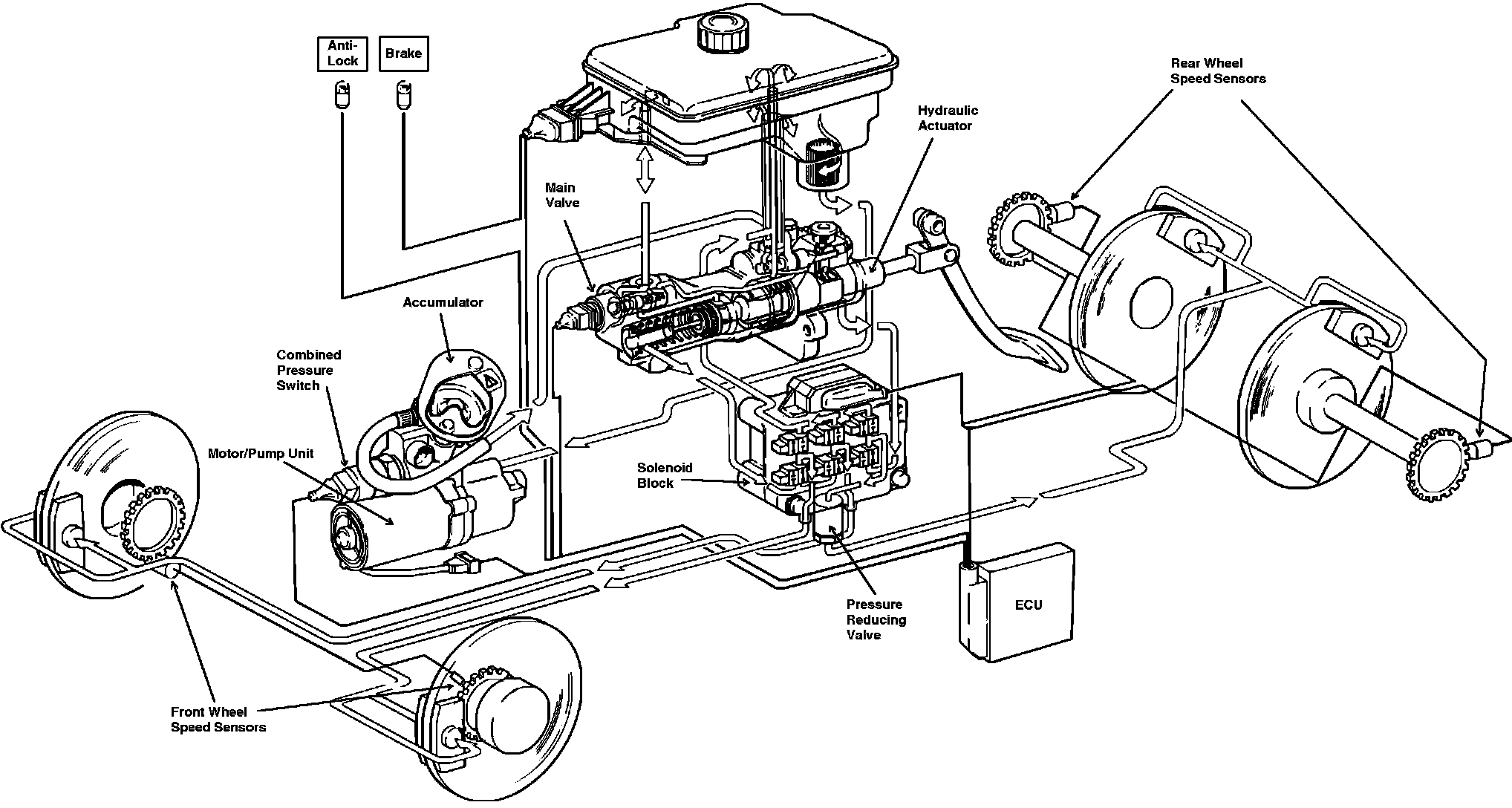 The ECU processes information from the wheel speed sensors and the various switches for system operation, control, and warnings.