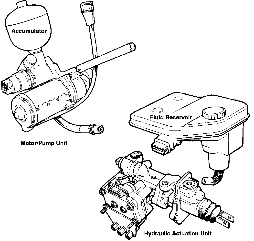 The hydraulic actuation unit contains the reservoir and the components used for pressure application, boost application, and anti-lock valving.