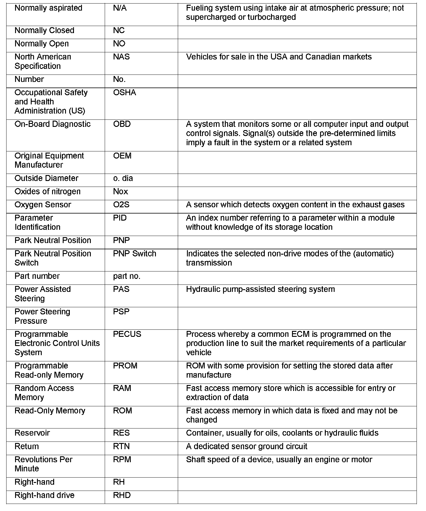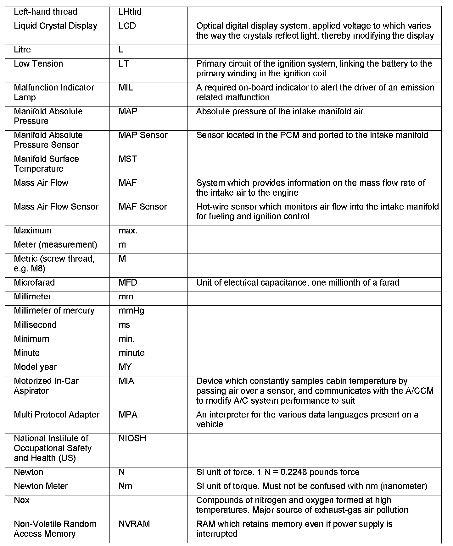 This glossary of terms is intended to cover mainly emissions-related (to SAE J 1930) terminology, and other abbreviations that may be used in this manual.