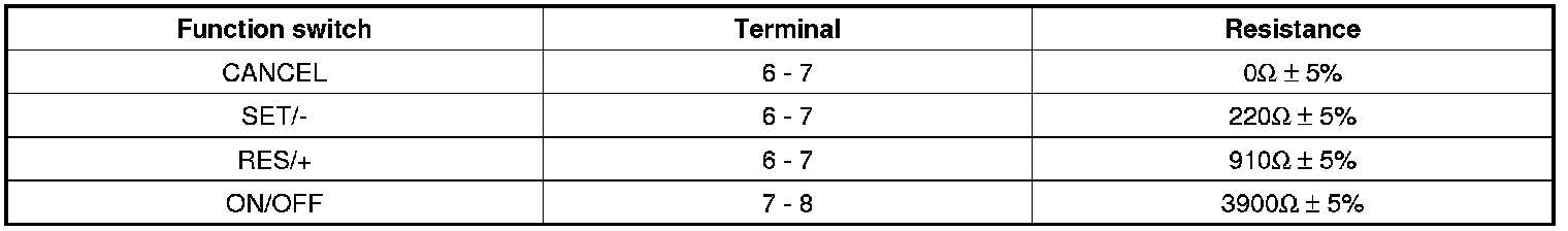 2. Measure resistance between terminals on the control switch when each function switch is ON (switch is depressed).