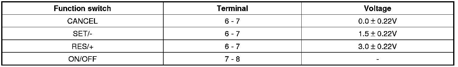 2. Measure voltage between terminals on the harness side connector when each function switch is ON (switch is depressed).