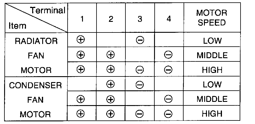 1. Check that the radiator fan rotates when battery voltage is applied between the terminals.