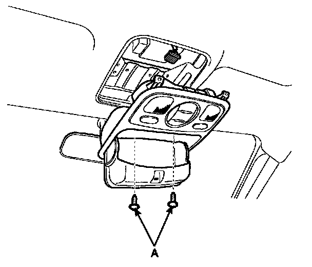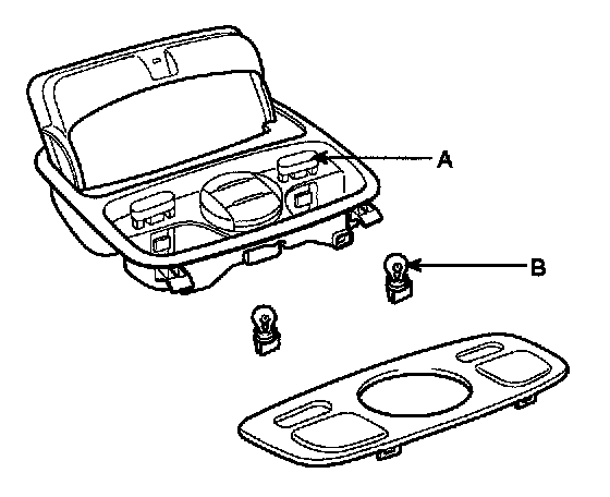 3. Disconnect the sunroof switch connector and lamp connector and then remove the overhead console (A) lamp (B).
