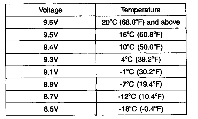 5. Compare the voltage reading with the minimum and replace the battery if battery test voltage is below that shown in the voltage table.