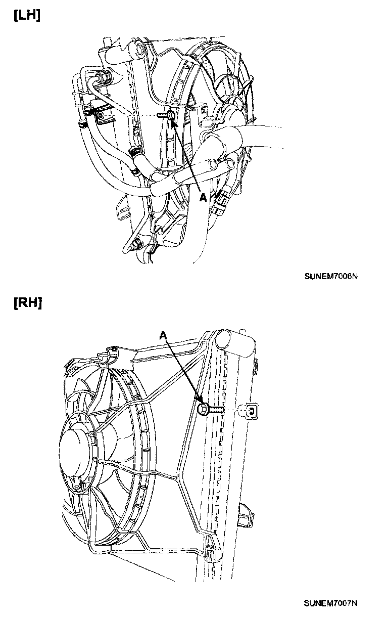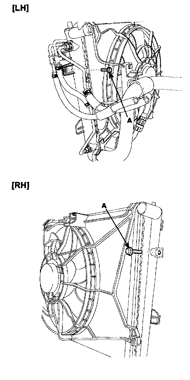 3. Install the radiator bracket(A) mounting bolt and coolant bleed hose(B).