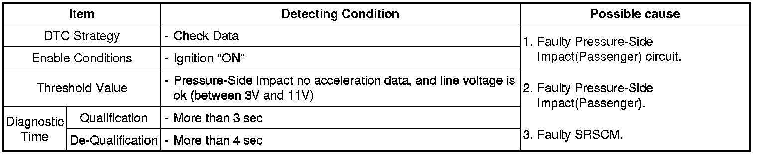The SCM detects the impact signals of the Pressure-Side Impact Sensor and Side Impact Sensor and compares with signals of the safe sensor inside. If the signals of all sensors are judged as a collision, the side-airbag and the curtain-airbag would be unfolded.
