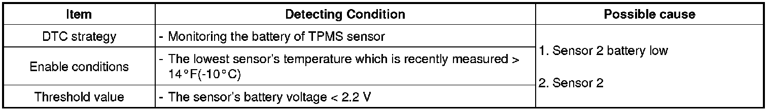 The TPMS ECU monitors the voltage of sensor's battery and if it is below 2.2 V, this DTC is set.