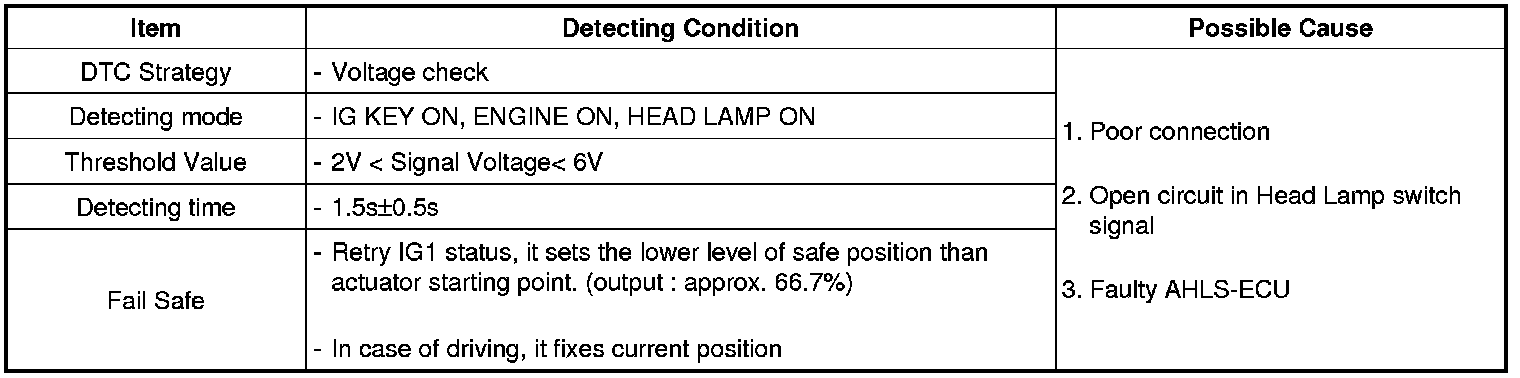 AHLS provides driver with the best visibility by adjusting vertical direction of the headlamp. It consists of AHLS ECU. Linkage and actuator. AHLS ECU detects the signal of headlamp switch which is operated by multi-function switch to diagnose the Headlamp light signal line.