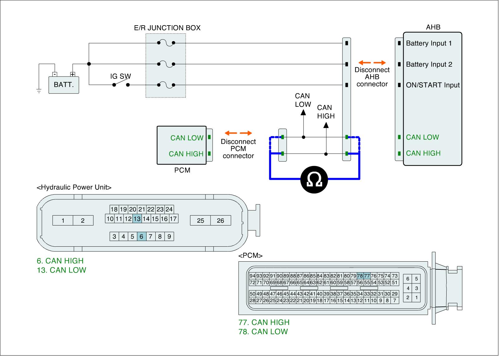 3. Measure resistance between CAN HIGH terminal (LOW terminal) of the AHB harness connector and CAN HIGH terminal (LOW terminal) of the PCM (ECM) harness connector.