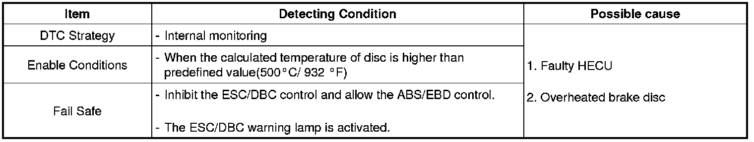 The HECU calculates a disc's temperature for a normal operation and if the calculated disc's temperature is over 500 °C (932 °F), this DTC is set.
