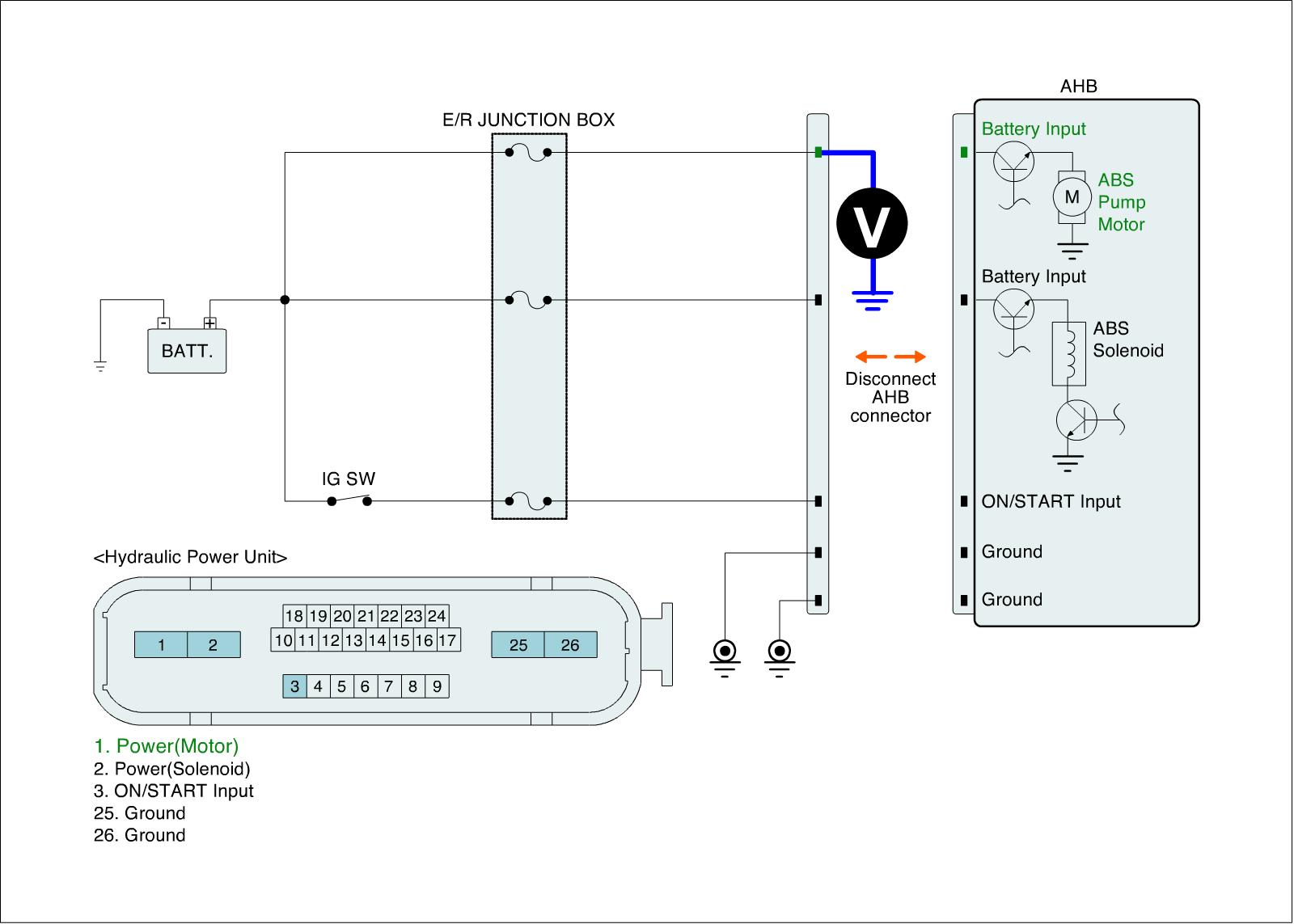 2. Measure voltage between motor power terminal of the AHB harness connector and chassis ground.